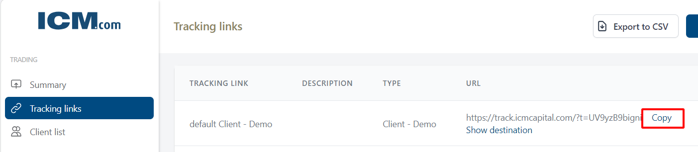 – Go to the IB management dashboard: https://clients.icmcapital.com/ib/tracking-links