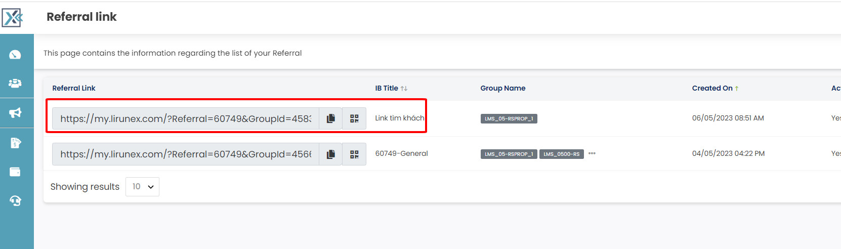 – Go to the IB management dashboard: https://backoffice.lirunex.com/IB/Dashboard