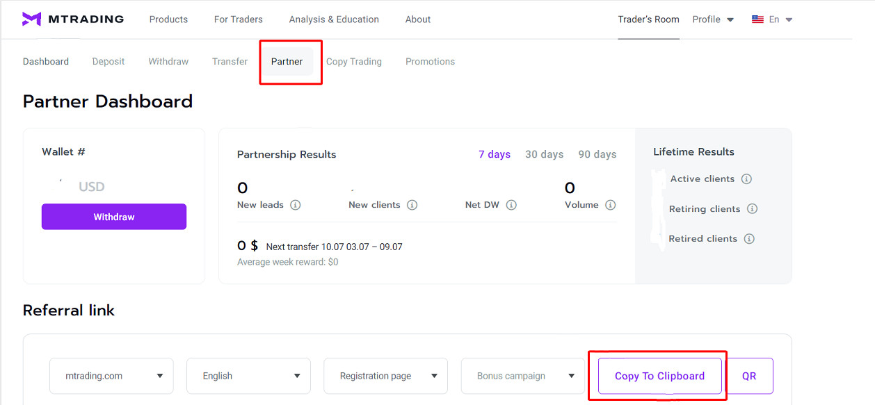– Go to the IB management dashboard: https://mtrading.io/auth/login?redirect=/dashboard/partner