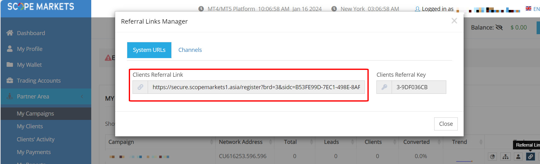 – Go to the IB management dashboard: https://clients.scopemarketsvn.com/en/dashboard/customer/ib-area/my-campaigns