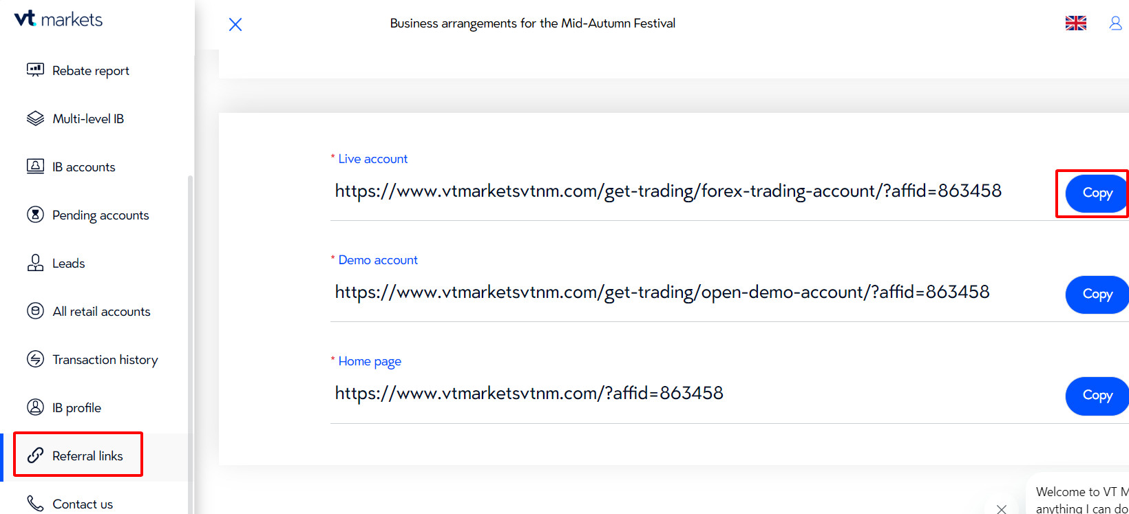 – Go to the IB management dashboard: https://myaccount.vtmarkets.com/home