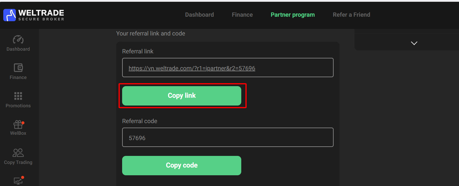 – Go to the IB management dashboard: https://account.weltrade.com/auth/login?returnUrl=%22%2Ftrader%2Fcontrol%22¶ms=%22%22